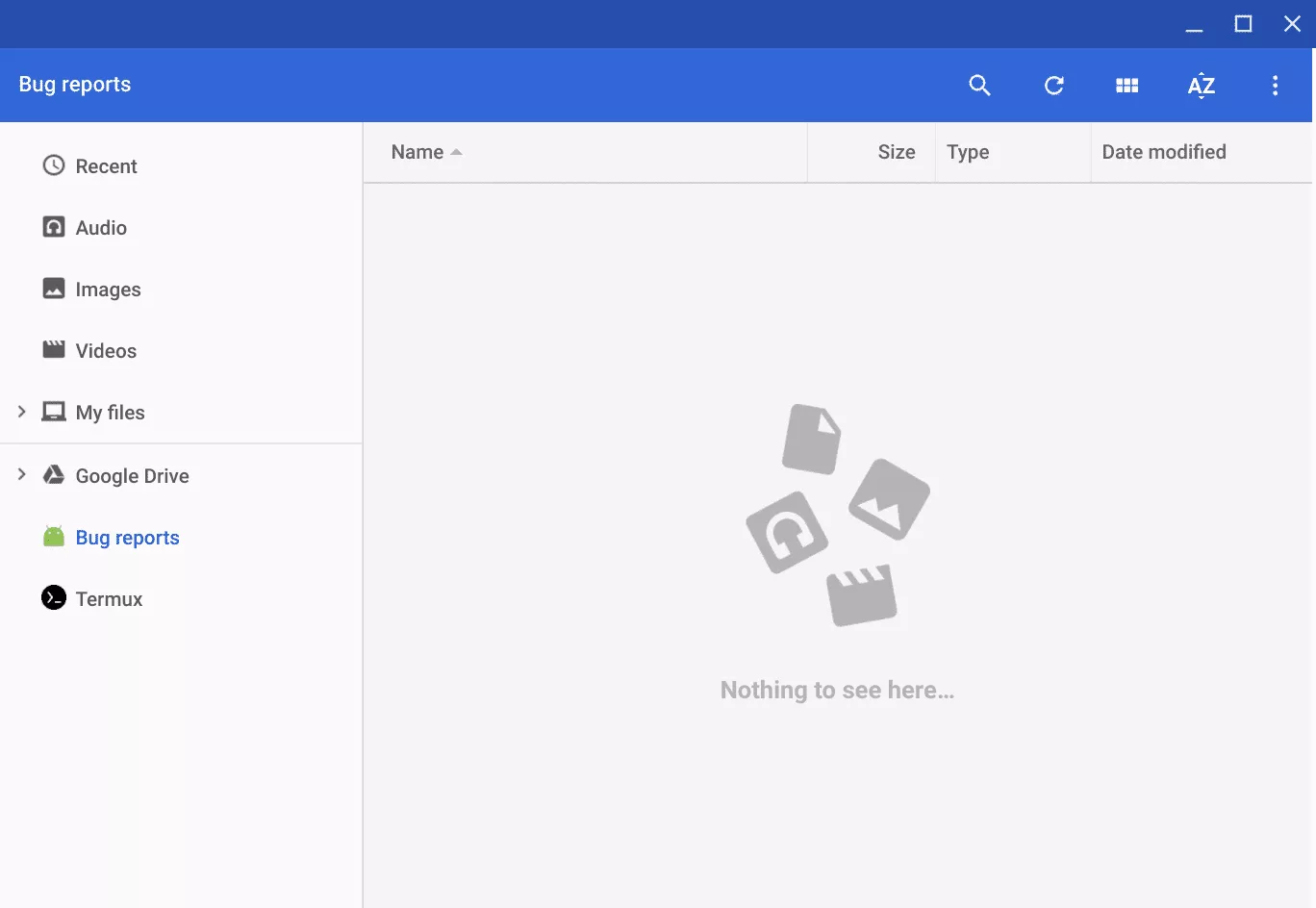 There is now a folder for “Bug Reports” and a Android Application that I have installed (termux) showing in the File Manager. Clicking on “Bug Reports” brings up a empty folder that is read only but the Termux folder shows the storage area of Termux.