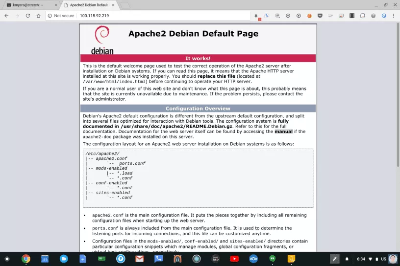 In my case, my IP Address is 100.115.92.219. This IP Address can be entered into the Chrome Browser on your Pixelbook and if everything went well, you should be greeted with the Apache Welcome Screen.