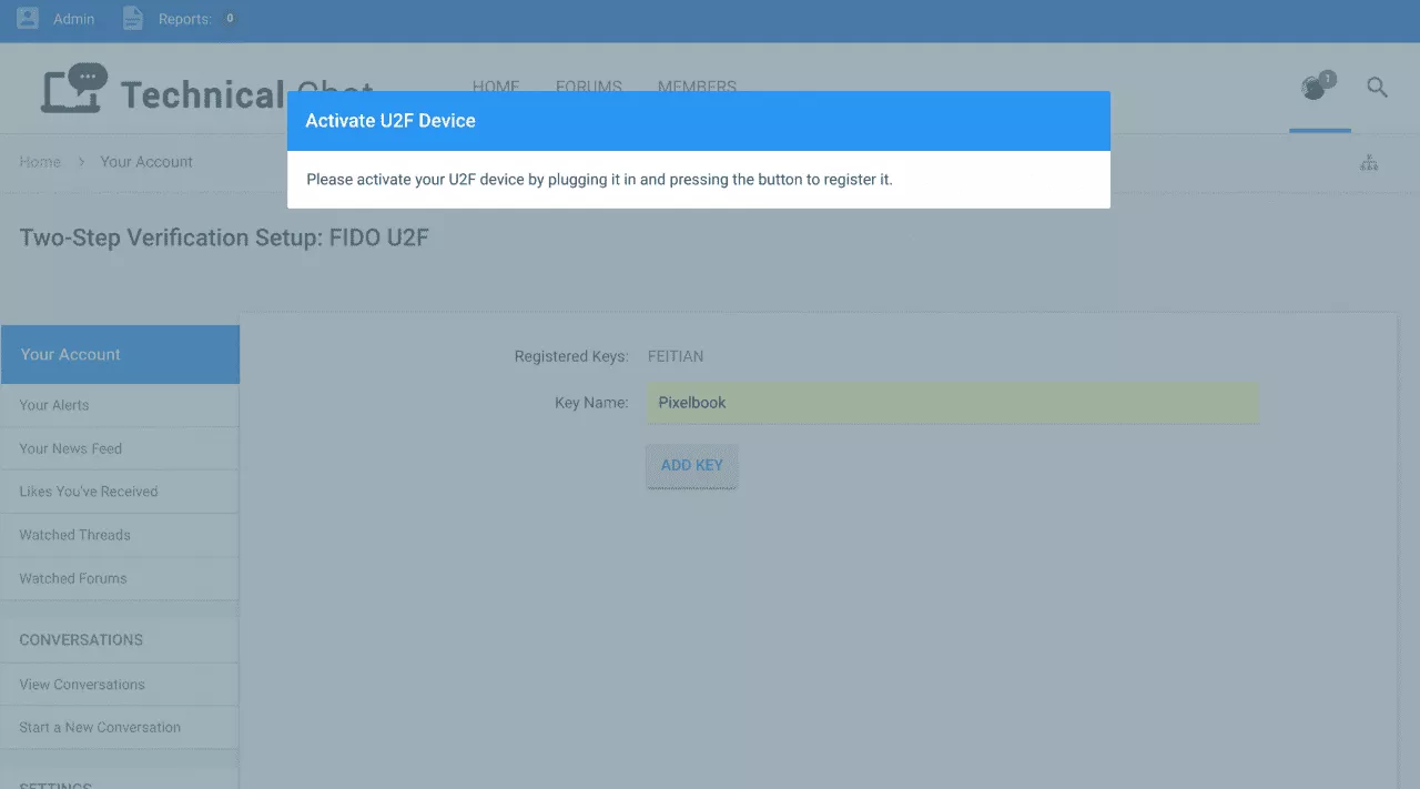 You can now test it by logging out of Technical.chat and logging back in. You may need to select “FIDO U2F” if you choose to activate other 2 factor features on that site. While you are there, feel free to drop in and introduce yourself – there are occasional prize giveaways for active members 🙂
