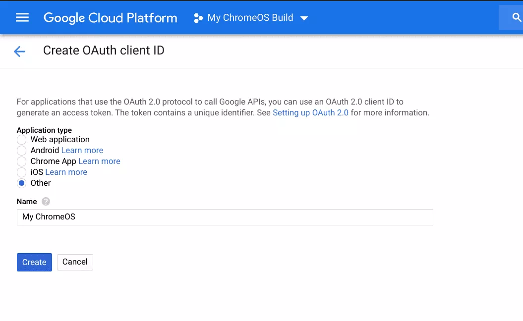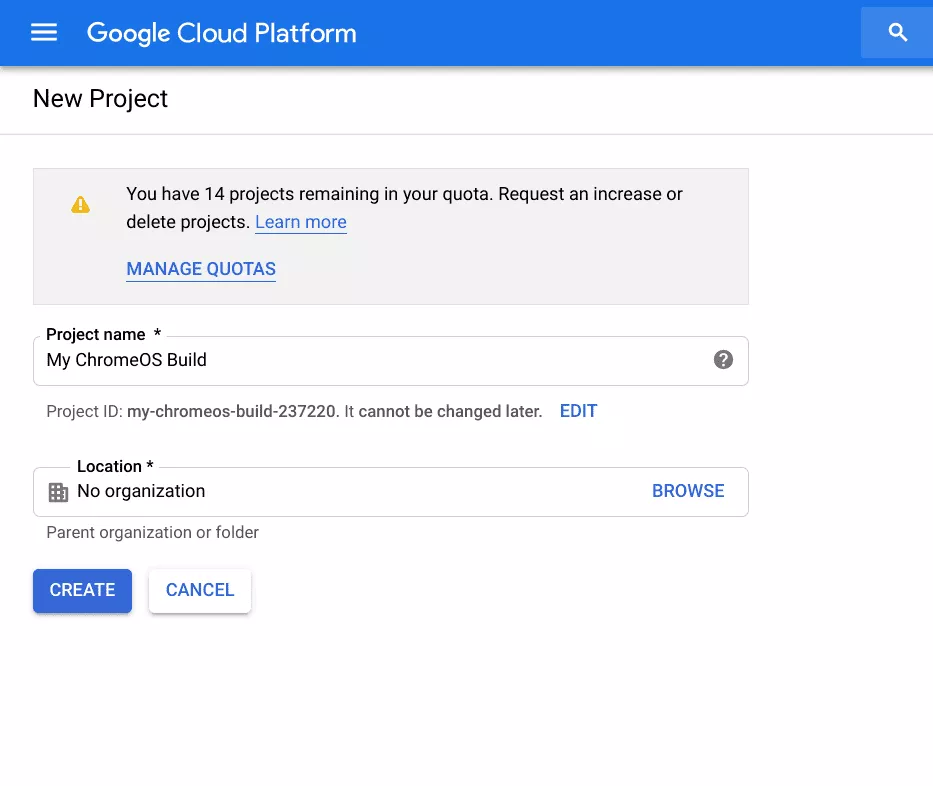 Enter a Unique Name for your Project, In my case, I will use “My ChromeOS Build” followed by “Create”