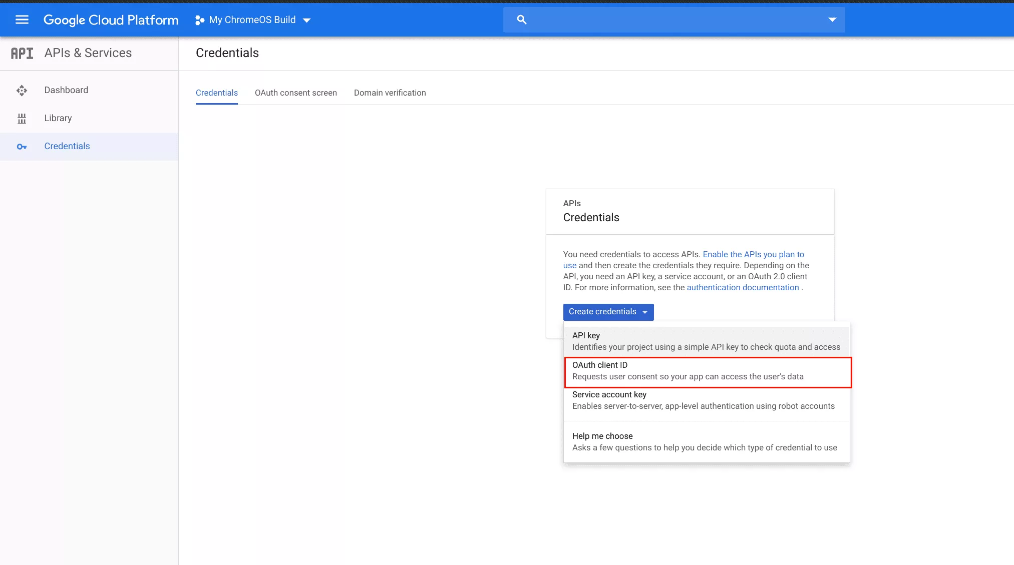 One you have enabled all of the API options above, go back to the main menu of the Cloud Development Console and select “APIs & Services” and select “Credentials”. Click on “OAuth Client”