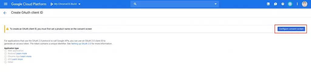 You will now be sent to a screen advising you to create the OAuth Client ID, select “Other” from the available options and “Create”