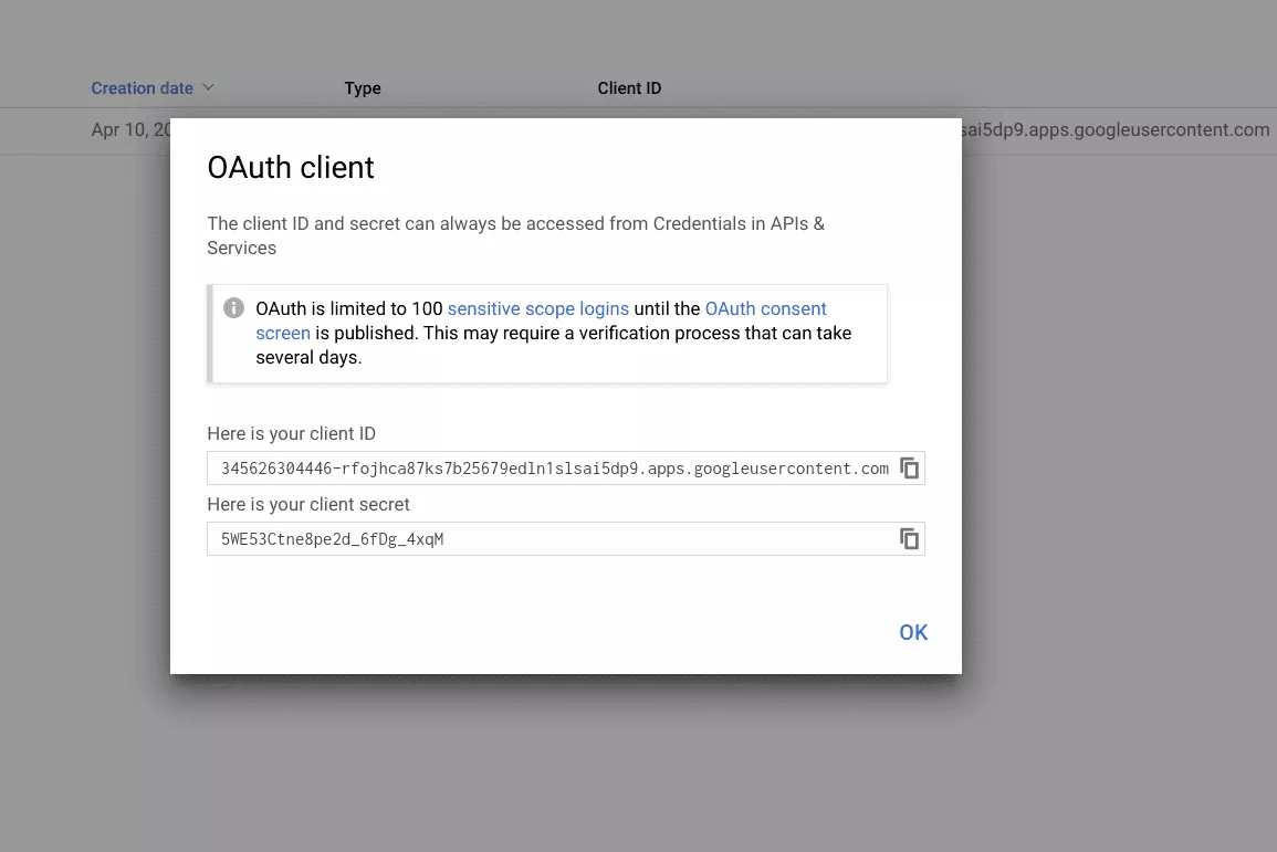 You will be given a set of credentials, please save them in a secure location. They will be needed again shortly. The client secret should be kept confidential – I will be revoking the ones in the screenshot below before publishing this guide. The client secret cannot be displayed again once you click “Ok” so ensure to save them before clicking “Ok”.