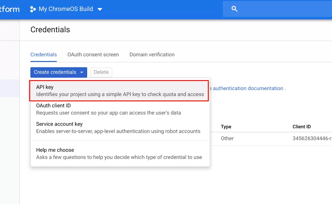 Finally select “Create Credentials” followed by “API Key” to get your API Key. Please also store this in a safe place.