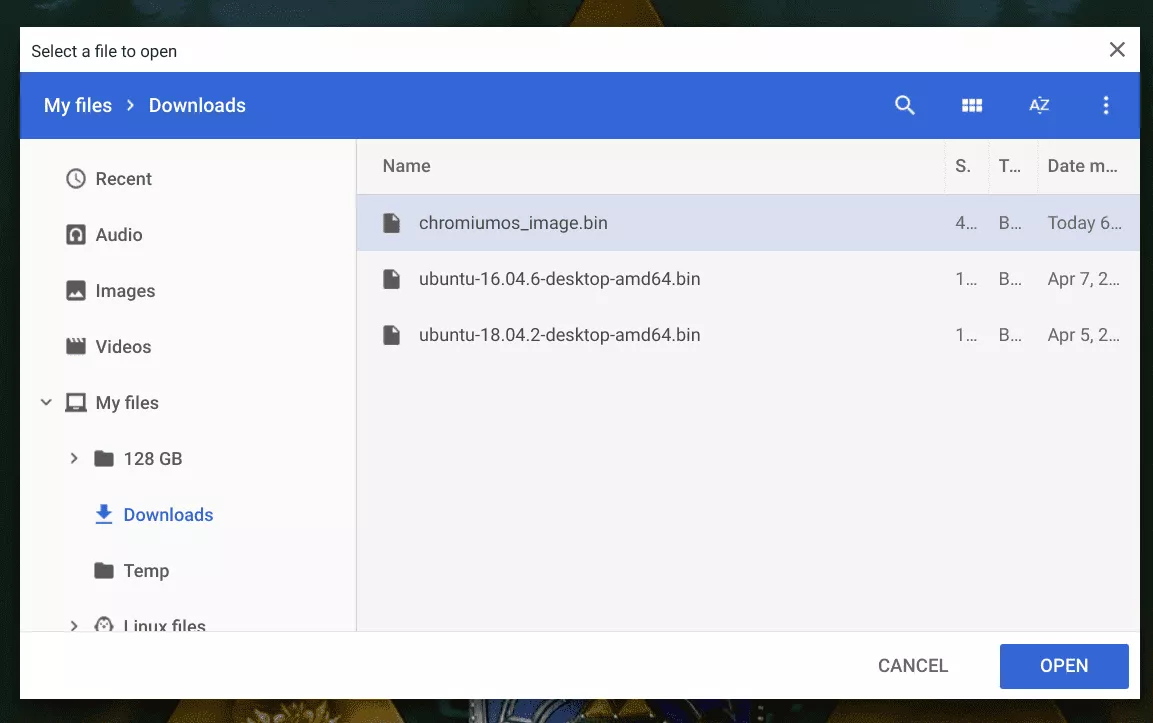 Select the “chromiumos_image.bin” that you downloaded earlier.