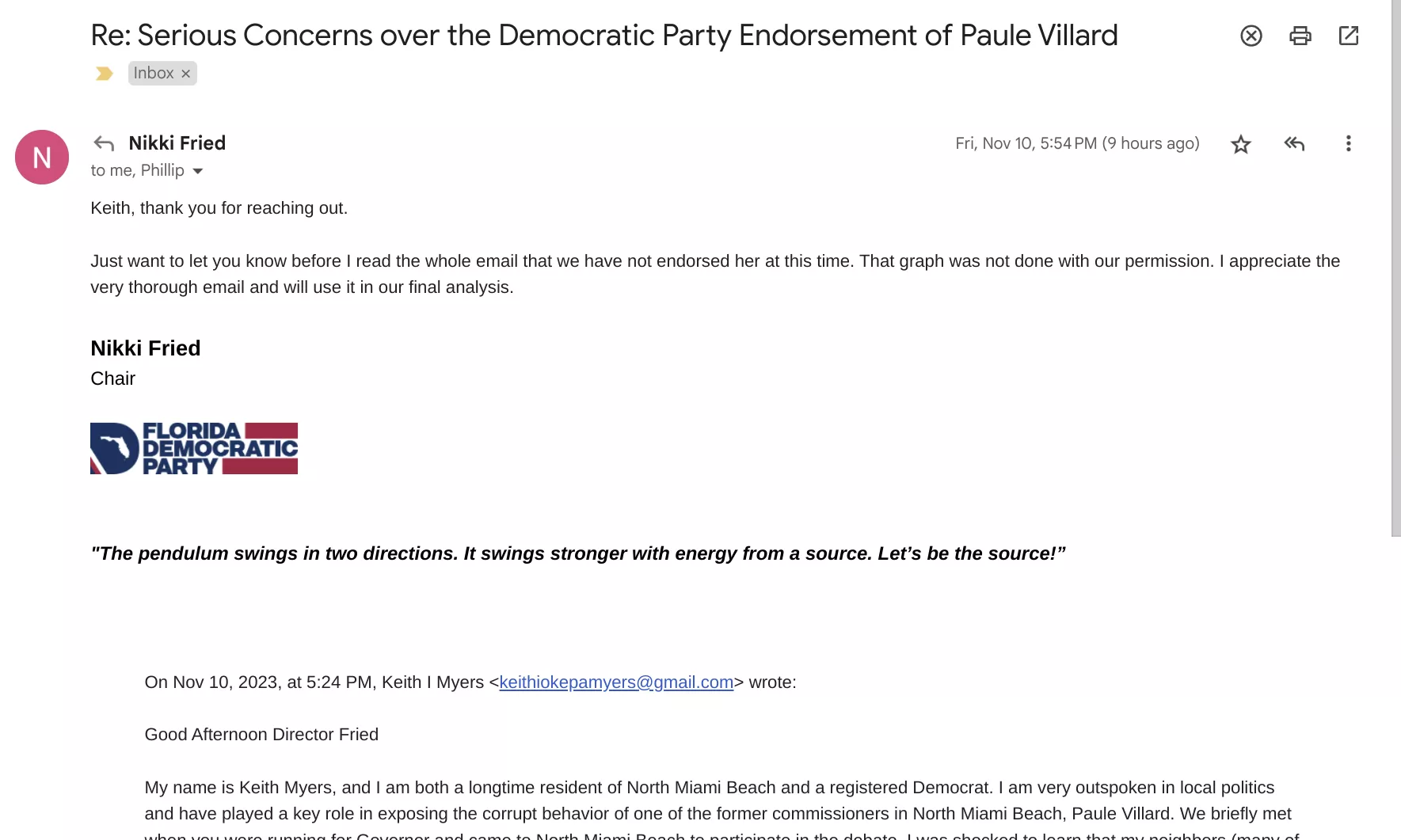 I sensed something was a bit off about the endorsement and was compelled to reach out to the Democratic Party of Florida to see if this was a true endorsement and if it was, provide them with evidence to make them reconsider and hopefully retract their endorsement if it was indeed official. I asked for someone to reach out to me with a statement and advised that I would be leaving the Democratic Party of Florida if they chose to endorse Paule Villard, especially after reading the email I sent.