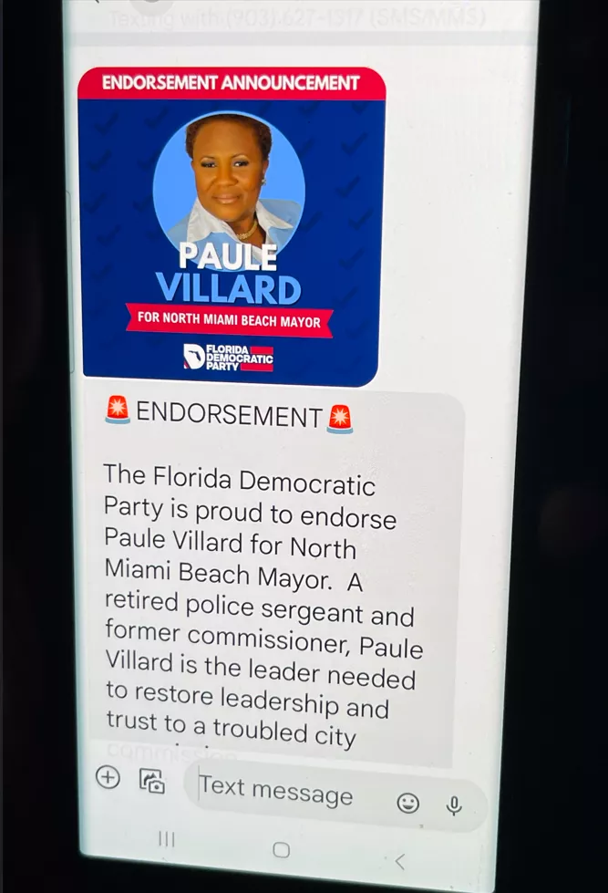 On the afternoon of Thursday, November 9th, residents of North Miami Beach started to recieve text messages from Paule Villard's campaign stating that Paule Villard was endorsed by the Democratic Party of Florida... the problem with this statement is that it was a lie, and she likely broke multiple laws in the process. Paule Villard is clearly digging into her bag of tricks and playing the same games that she played in the 2022 elections.