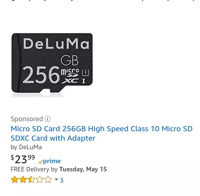 - B07CGKRFPQ DeLuMa 256 GB MicroSD Card ($23.99 with Free Amazon Prime Shipping) – This card was actually listed as a “Sponsored” MicroSD Card (Pictured Above)