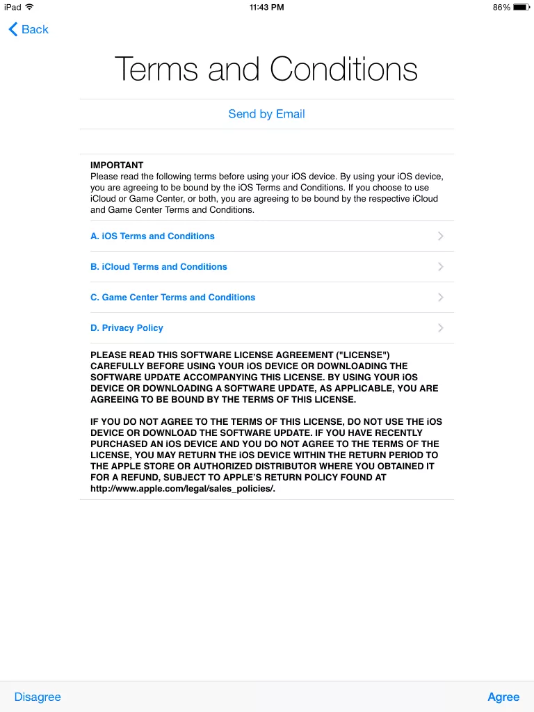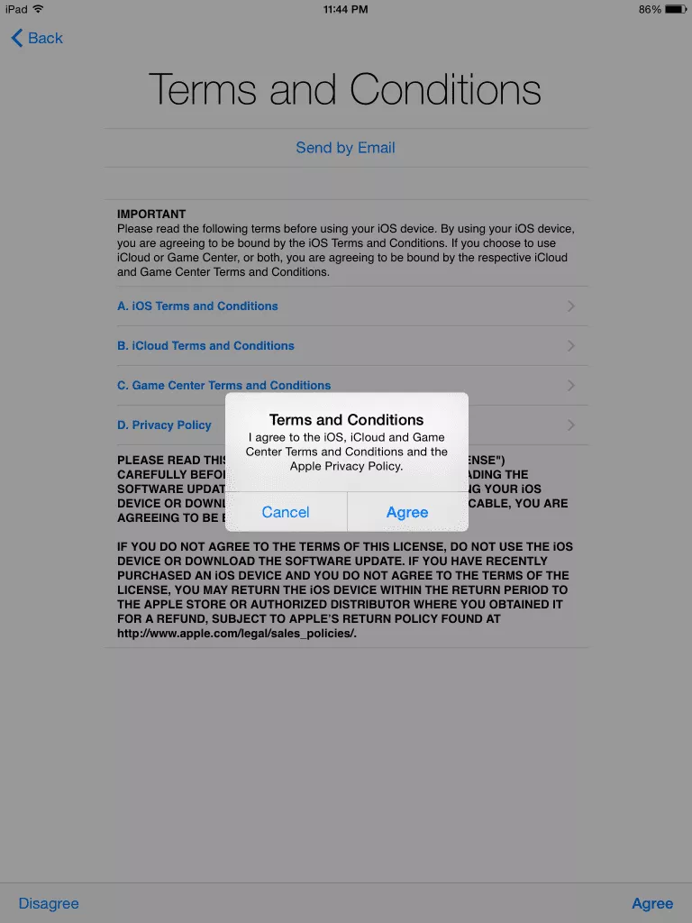 Well, today kicks off my first day using an Apple iPad Air as my primary tablet and I am trying my best to keep an open mind… but this is hard! Apple owners often tell me that one of the key differentiators between iOS and other mobile operating systems is the simplicity of use and setup. With this in mind, I powered on the iPad and began the setup process, I think Apple may have re-defined the word “simplicity” to mean “A setup wizard with over 30 steps and 3 days of reading agreements”. Don’t believe me?