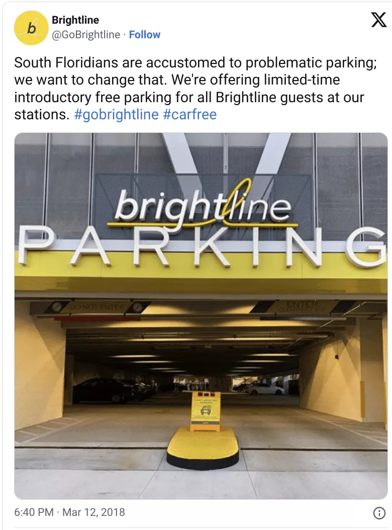 I arrived at the station about an hour early so I can take my time and explore a bit before my train departs. When entering the parking garage, there were several signs posted saying that the parking is currently free in the “Introductory Period for Brightline Customers”. It is clear that Brightline is going to be charging for parking in the near future. This complimentary parking during the Introductory Period is something that Brightline is very proud of – they even boasted about this on Social Media.